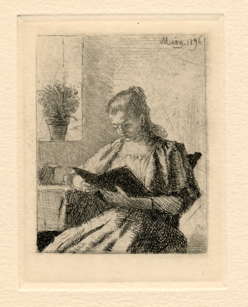 Assise de trois-quarts à gauche, tenant un livre des deux mains ; à gauche, un vase de fleurs dans l’embrasure d’une fenêtre.