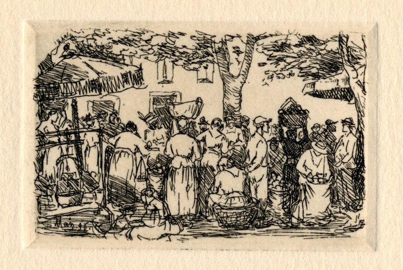 À gauche, un parasol ; au centre, un arbre et un autre à droite ; des femmes pèsent des légumes à la balance romaine.