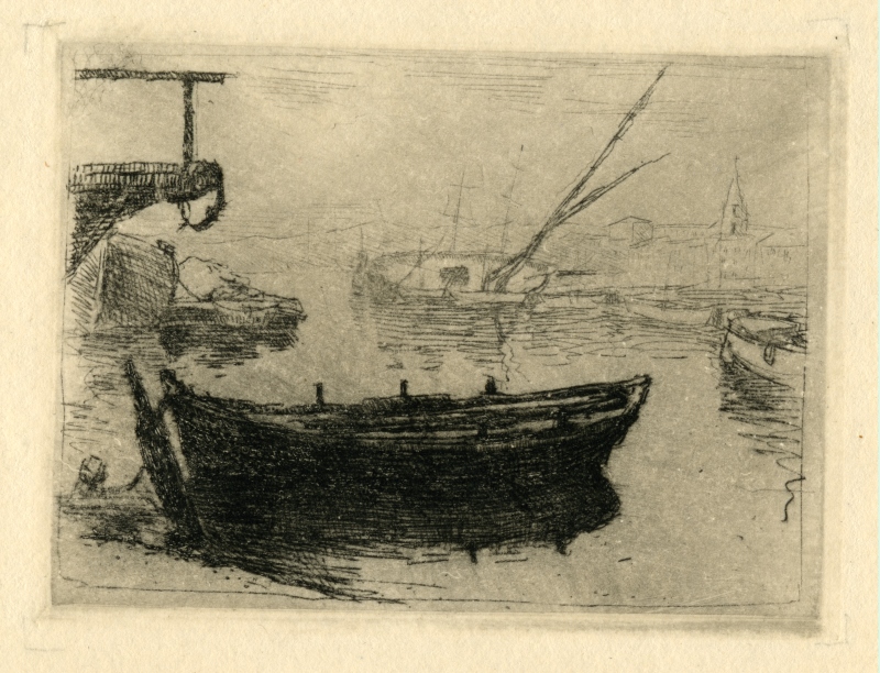Une barque au premier plan, d’autres barques plus loin.