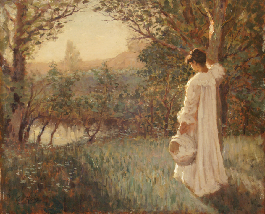 Au premier plan, à droite, une jeune femme, vêtue d’une longue robe blanche, est debout, le bras droit appuyé à un arbre. Elle tient de sa main gauche un grand chapeau. Une petite mare se devine à travers les feuillages, à gauche. C’est sa femme que le peintre a représenté ici.