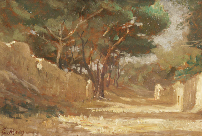 Dans une pinède, un chemin encadré de deux vieux murs en partie démolis. Lumière venant de la gauche.