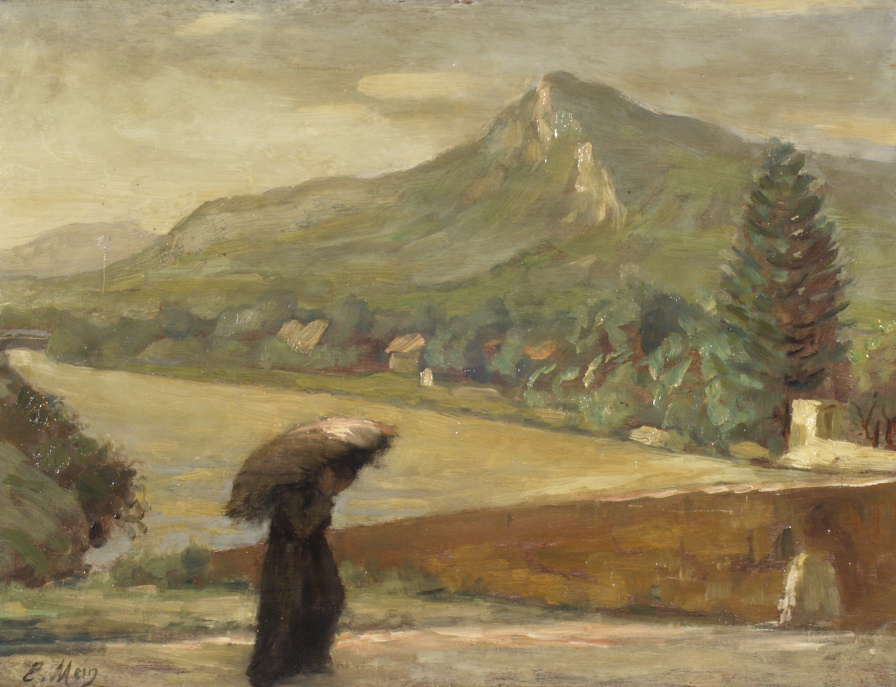 L’Arve, vue du Vieux-Pont, s’enfuit au loin vers la gauche. À droite, le Mont Orchez. Au premier plan, une femme, portant un gros sac sur le dos, s’engage sur le pont dont on voit le parapet, à droite. Temps couvert.