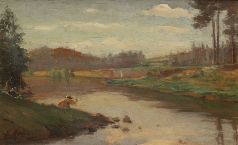 La rivière reflète des nuages roses. À gauche, des pêcheurs.