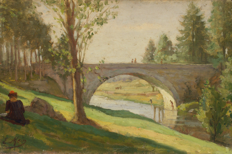 La claire rivière est traversée par un pont, vu à contre-jour. Des arbres de chaque côté. Au premier plan, à gauche, une femme est assise dans l’herbe du talus qui descend vers la rivière.