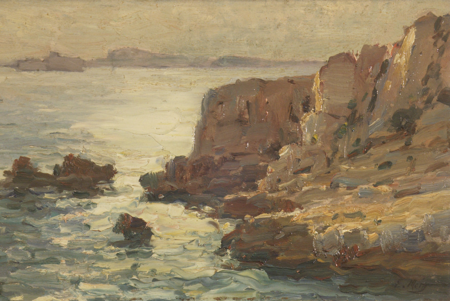 À droite, rochers au bord de la mer. Au centre, lumineux miroitement de l’eau. Au fond, on distingue les îles du Château d’If et du Frioul.