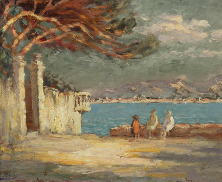 Un terre-plein bordé d’un parapet domine la mer bleue. À gauche, un mur avec portail et petit balcon, ferme un jardin où s’élèvent de grands pins, dont les branches s’avancent jusqu’au milieu du paysage. Deux femmes et un enfant vêtu de rouge. Au fond du golfe, collines. Lumière vigoureuse de la côte méditerranéenne.