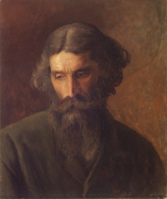 La tête penchée et légèrement tournée vers la gauche, l’homme regarde vers le bas. Le visage est maigre. Longue barbe, moustaches et longs cheveux bruns, légèrement grisonnants.