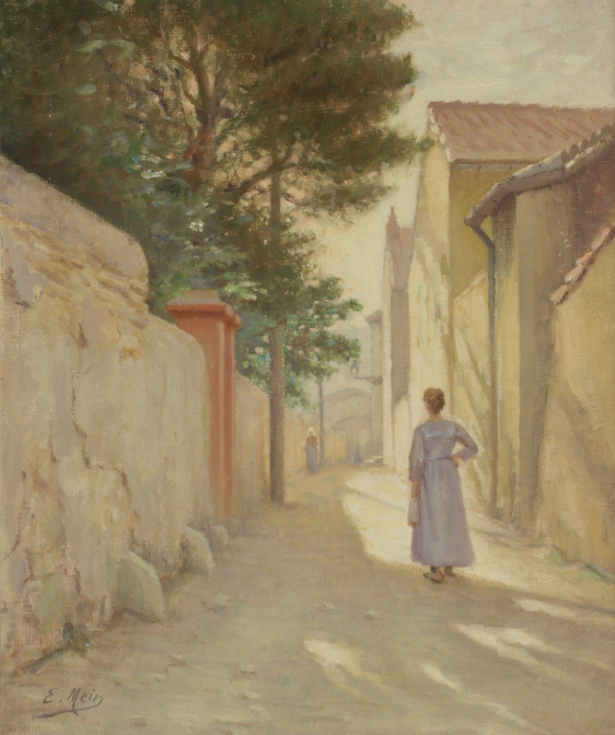 Dans la claire lumière du matin, une femme, vue de dos, marche dans la traverse bordée, à droite, par des maisons ; le soleil est caché par des pins qui s’élèvent derrière un mur, à gauche.