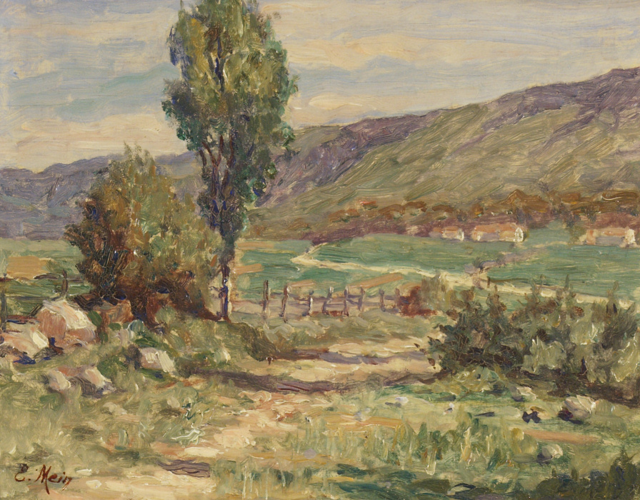 Un petit chemin ensoleillé au milieu des champs. À gauche, un arbre et des arbustes. Au fond, le hameau des « Chaberts » et la chaîne du Vercors.