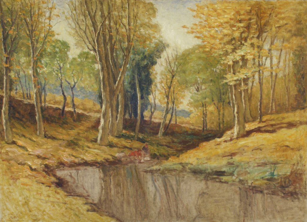 Dans un petit vallon, un ruisseau aux eaux calmes reflète de grand arbres aux feuillages d’or. Le sol est couvert de feuilles mortes. Seul, dans ce paysage d’automne, un bouquet d’arbres demeurés verts met une tache sombre. Au tournant du ruisseau, deux femmes lavent.