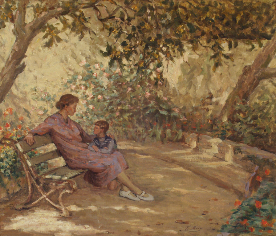 Dans un jardin ombragé et fleuri, une femme est assise sur un banc, la main sur l’épaule d’un garçonnet agenouillé près d’elle. Cette étude représente la femme du peintre avec un garçonnet voisin, dans le jardin de la villa que l’artiste habitait dans le quartier de Bompard.