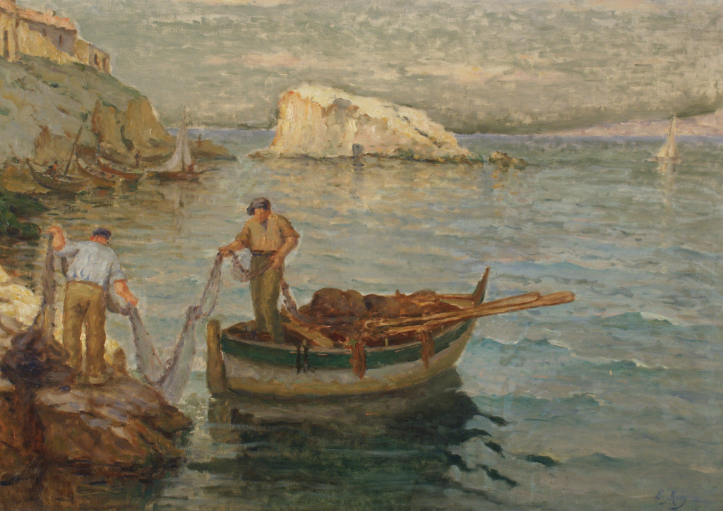 Se détachant sur l’eau claire, un homme, debout dans une barque, dans l’ombre, lave ses filets ; il est aidé par un autre pêcheur placé à gauche sur des rochers. Plus loin, maisons sur la côte rocheuse et petite île.