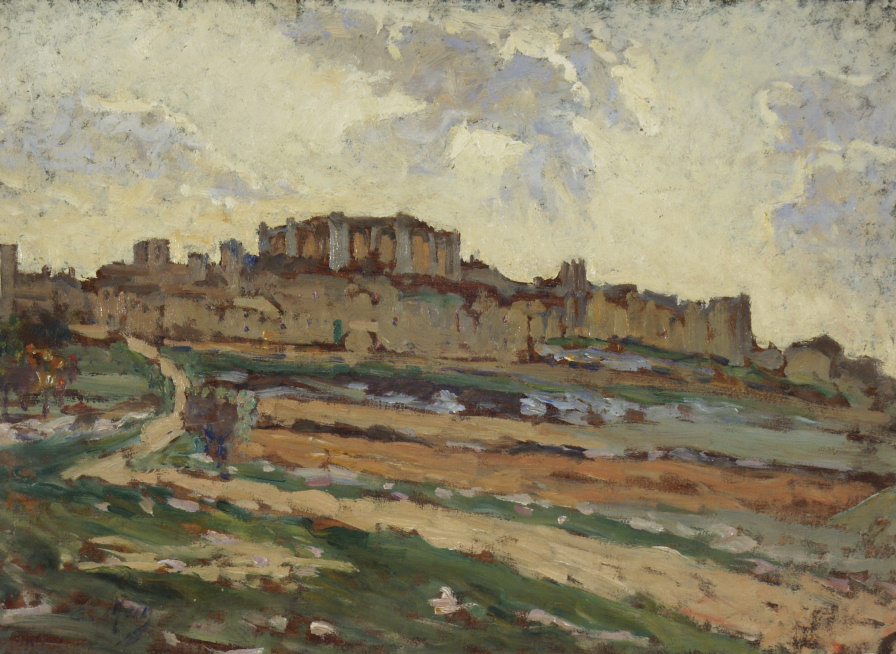Au sommet d’un coteau; dans l’ombre, le village de Lançon et son vieux Château se détachent sur le ciel clair.