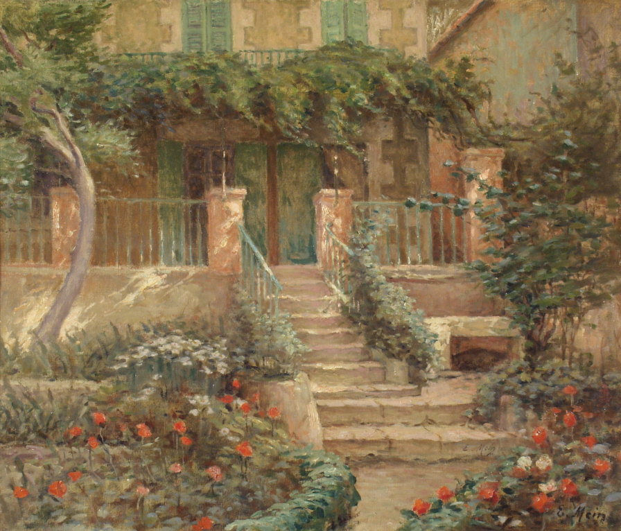 Un jardin fleuri devant une maison aux volets verts ; un escalier, au centre, conduit à une terrasse ombragée d’une treille de vigne vierge.