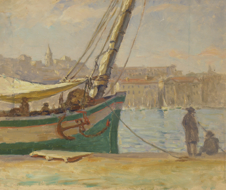 À gauche, un voilier vert dont on ne voit que l’avant est amarré au quai de Rive-Neuve. Au fond, les Vieux-Quartiers de Marseille. Deux personnages, à droite, sont à peine esquissés.