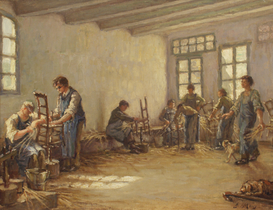 Dans une salle aux mur nus, des aveugles travaillent à rempailler des chaises.