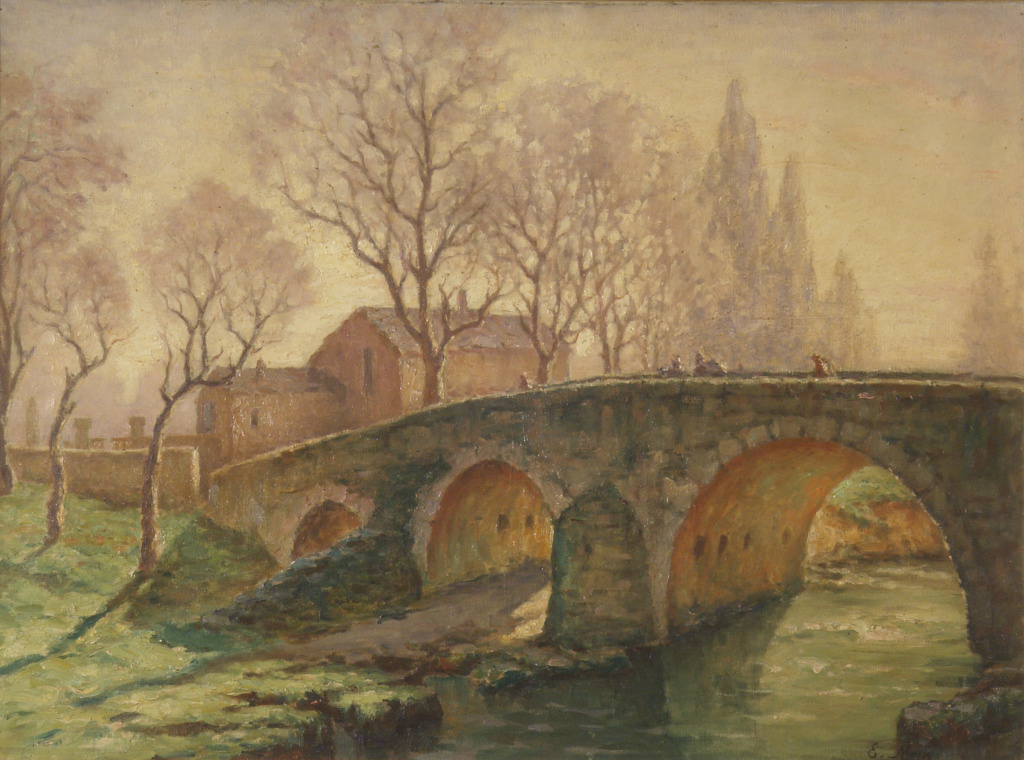 Un vieux pont à trois arches, vu à contre-jour, enjambe une petite rivière aux eaux vertes. Des arbres dépouillés se dressent sur le ciel pâle.