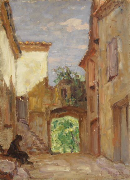 Rue de villag passant au fond sous un porche. Une femme est assise à gauche. La rue est dans l’ombre.