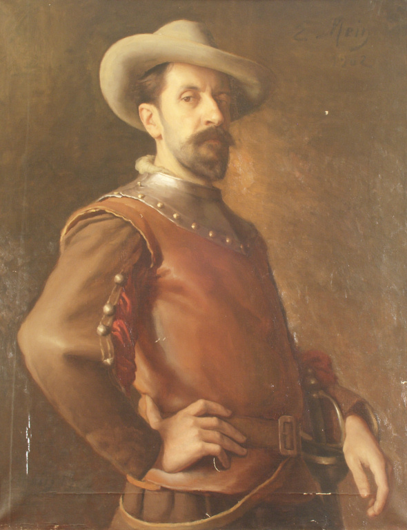 Ce personnage, sous les traits duquel on reconnaît le peintre, est vu à mi-corps. Il est tourné vers la droite, le poignet gauche appuyé sur l’épée ; la main droite sur la hanche. La tête, vue de trois-quarts, est coiffée d’un feutre aux bords relevés. Il porte un haubergeon de cuir à collerette de métal.