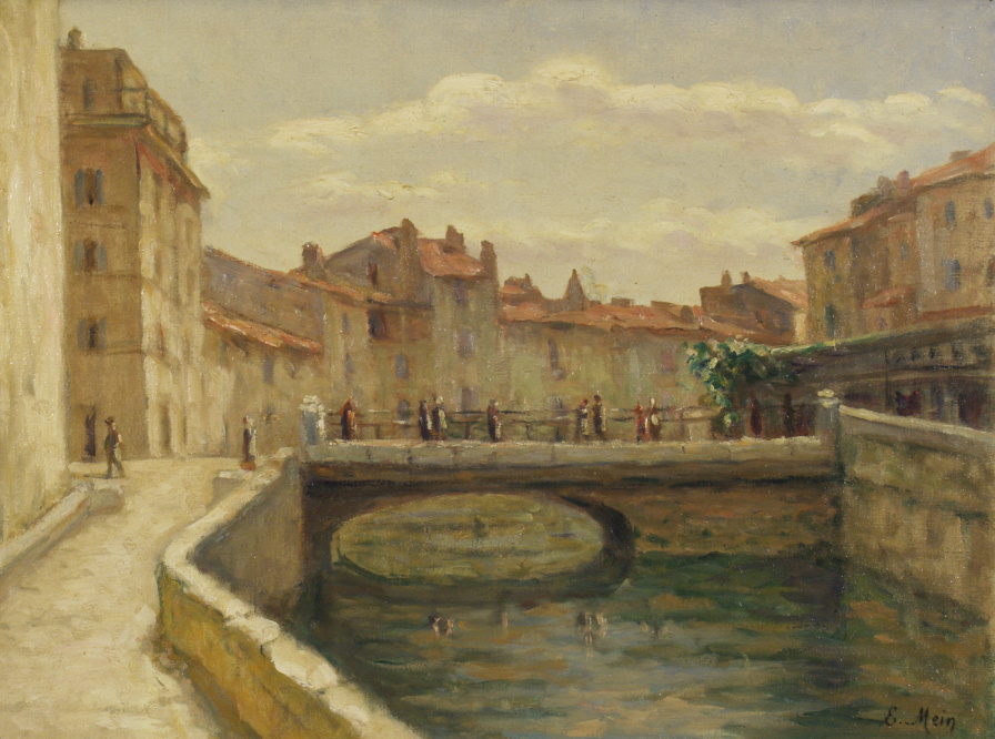 Un canal des Martigues, vue du quai qui longe l’église Sainte-Madeleine dont on voit le grand mur à gauche. En face, un pont, qui se reflète dans l’eau ainsi que les personnages qui le traversent.