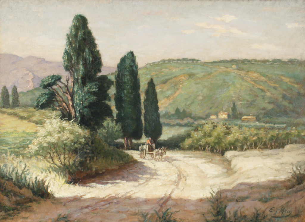 Le chemin tourne vers la gauche. Trois cyprès se détachent sur les vallonnements du fond. Le premier plan est dans l’ombre. À gauche, une trouée lumineuse fait flamboyer les herbes sèches et la route blanche. Au tournant du chemin apparaît une petite charrette tirée par un âne, et conduite par une femme vêtue de rouge.