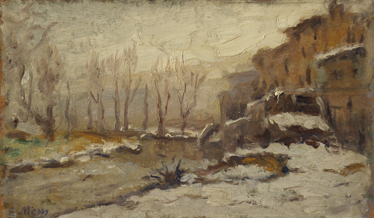 À droite, des maisons couvertes de neige s’élèvent sur le bord d’une rivière. En face, sur l’autre rive, des arbres dépouillés. Lumière douce et grise d’un ciel couvert. Peint dans les environs de Marseille, à Saint-Marcel.