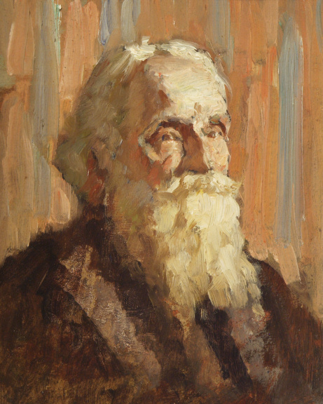 Il est vu de trois-quarts à droite. La grande barbe et les cheveux sont blancs.
