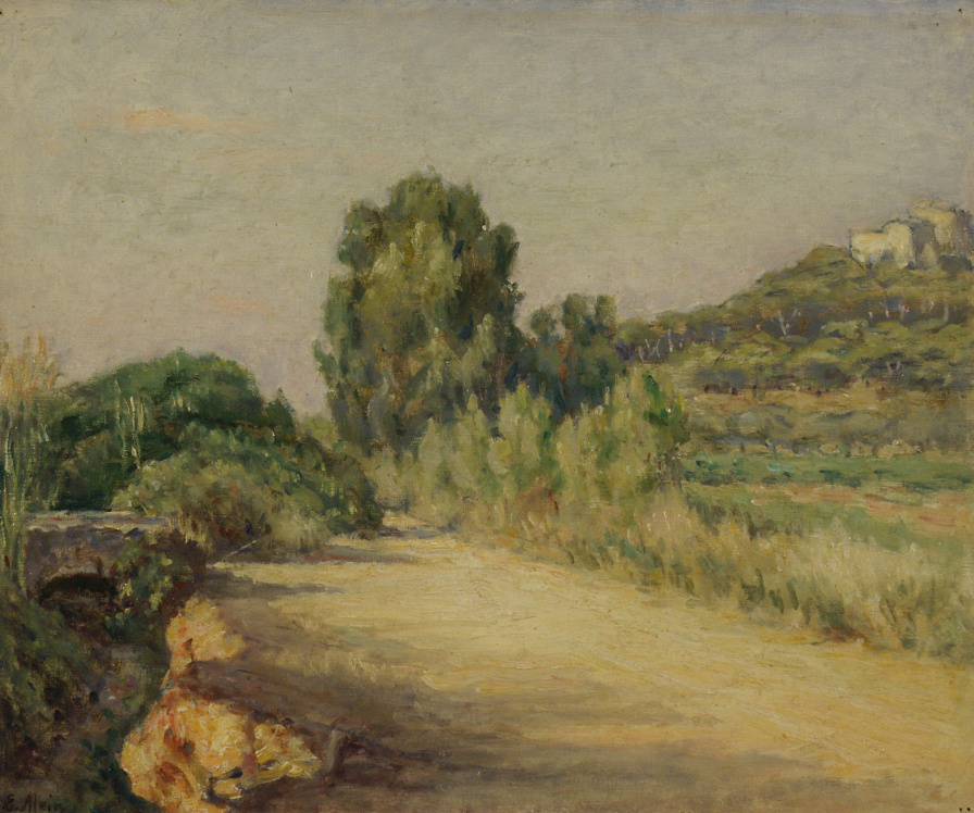 Le chemin est bordé, à gauche, par un ruisseau que traverse un petit pont. À droite, colline au sommet de laquelle on aperçoit le fort Sainte-Agathe.