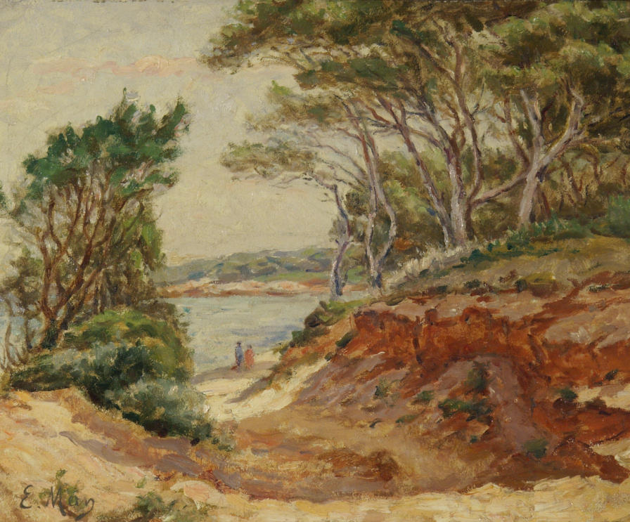 Une tranchée de terre rouge conduit à la page de la Courtade. À droite, sur le talus, de grands pins ; à gauche, arbuste et buissons verts. On aperçoit la mer bordée de collines.