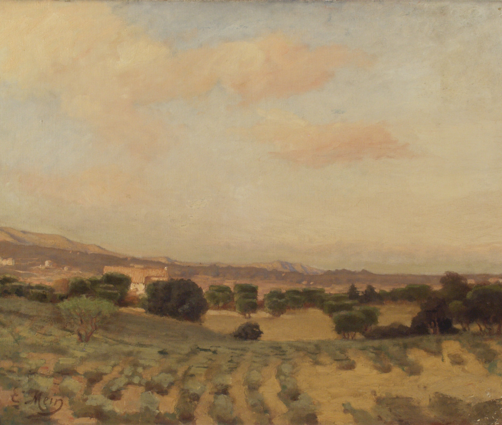 La campagne aux environs d’Allauch. Le premier plan, avec ses champs parsemés de sombres oliviers, est encore dans l’ombre. Plus loin, les premiers rayons du soleil dorent le paysage, qui se termine par une ligne de collines. Un grand ciel, avec quelques nuages roses, occupe plus de la moitié de la toile.