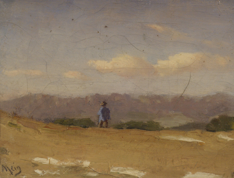 Sur un plateau dénudé, un homme marche. Fond de collines. Nuages.