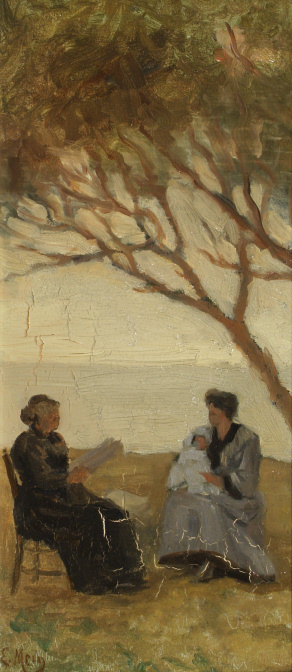 Sous de grand pins, dans un paysage dominant la mer, deux femmes sont assises. Celle de droite tient un bébé sur les genoux. L’autre, âgée, vêtue de noir, lit un journal.